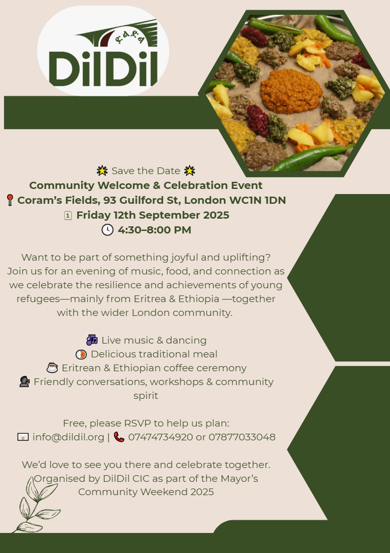 Event Details:π Coramβs Fields, 93 Guilford St, London WC1N 1DNπ Friday 12th September 2025π 4:30 β 8:00 PM Description:Join us for an evening of music, food, and community as we celebrate the resilience of young refugees from Eritrea & Ethiopia with the wider London community. β¨ Highlights: πΆ Live music & dancing π² Traditional meal […]