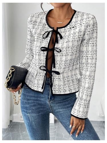 - Features: Long sleeve, plaid print, contrast binding, knot, colorblock, round neck, cropped, elegant jacket for women,