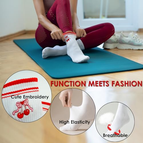 Pilates Socks with Grips for Women Yoga Grippy Socks Cute Heart Cherry Bow Pattern Barre Non Skid Athletic Crew Sticky Sock Gym Fitness Hospital White Sock