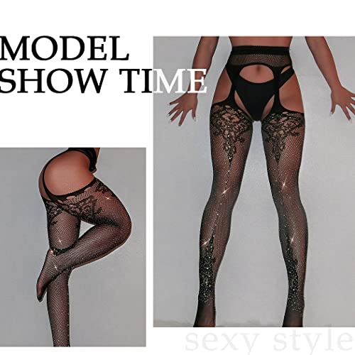 CanB Rhinestone Fishnet Stockings High Waist Tights Sexy Fishnets Thigh Suspender Pantyhose Stockings for Women and Girls