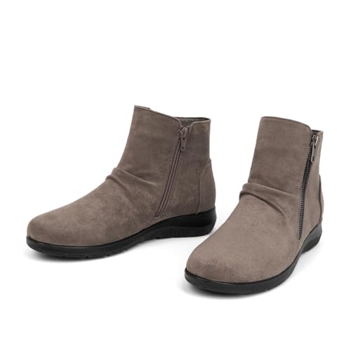 Sole material: RubberOuter material: Faux LeatherClosure type: ZipWater resistance level: Water ResistantComfortable: Our orthopedic ankle boots for women are designed with round toe which offer roomy fit. The soft and skin-friendly lining with removable foam cushioned insoles can bring comfy feeling which help relieve foot pressure and fatigue, ideal for bunion or sensitive feetMaterial: Featuring with smooth and soft faux leather upper, these casual ladies’ ankle boots are stretchy and water-resistantLightweight & Sturdy: Our lightweight ankle booties for women with sturdy and flexible non-slip PU sole can reduce the burden for your foot and make you feel freedom during walking. The low heel provides walking and standing safetyEasy On & Off: Inside zippers of these classic boots make you slip on and get off easierClassic & Chic: Simple but trendy round toe boots with drape design can match with any wearing, such as jeans, leggings, trousers, dresses, skirts, sweaters, trench coats etc. What’s more, our women’s boots are suitable for Spring, Autumn, Winter and ideal for many occasions, like daily, walking, travelling, working, shopping, school, meeting, vacation, travelling, casual, supermarket, airline, dancing, church, cruise, drive, etc Perfect for everyday use. excellent materials and excellent craftsmanship ensure long-lasting durability.