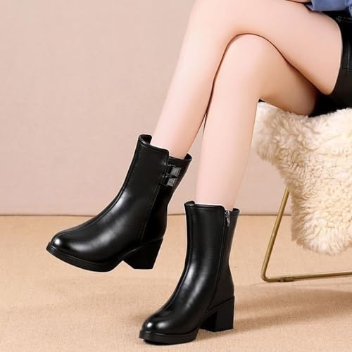 More information about Women's Leather smooth Sole Chunky Heel Booties with Buckle Decor Round Toe Side Zipper Mid Block Heel Office Business Dress Ankle Boots