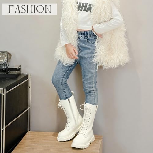 Girls Leather Lace Up Combat Knee High Boots with Side Zipper Fashion Buckle Straps Comfort Round Toe Chunky Heels Riding Boots Non Slip Lug Sole Motorcycle Boots Little Kid/Big Kid