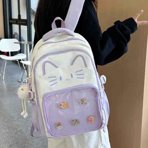 Unique Design: This backpack features an adorable and trendy cat theme that appeals to fashion enthusiasts who love expressing their personality through accessories. The design is both cute and sophisticated, making it suitable for various occasionsPin Badge Display: Equipped with a special section for showcasing collectible pins or badges, this bag allows you to personalize your accessory and stand out from the crowd. Itβs a perfect match for those who enjoy collecting and displaying unique itemsSpacious & Organized Interior: Inside, the backpack offers ample room for organizing daily essentials such as tablets, wallets, makeup, and more. Multiple compartments ensure everything stays neatly arranged and easily accessible when neededComfortable Carry Experience: Designed with ergonomic padded straps and a lightweight structure, this travel bag ensures comfort during long days of exploration or commuting. The adjustable strap length fits most body types for personalized wearDurable Material: Constructed from high-quality materials, this backpack is built to last. Its sturdy construction and fine craftsmanship guarantee durability against daily wear and tear, while maintaining a fashionable appearance over time Perfect for everyday use. superior materials and excellent craftsmanship ensure long-lasting durability.