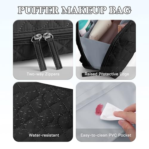 TOPEAST Makeup Bag for Women, Quilted Travel Cosmetic Bag Large Capacity Puffy Make Up Bag Pouch, Open Flat Waterproof Toiletry Bags Organizer for Traveling, Black