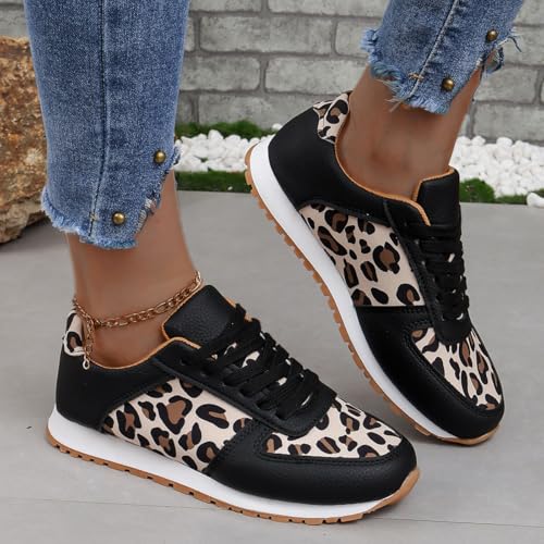 in-demand ! Women's Leopard Print Fashion Sneakers, Black and Tan Athletic Shoes with Lace-up Design