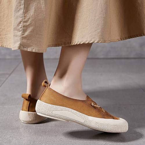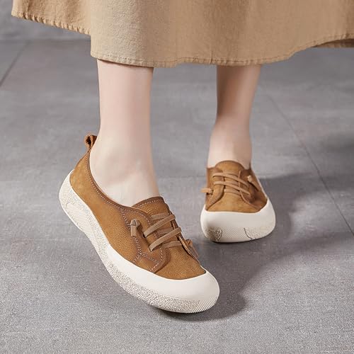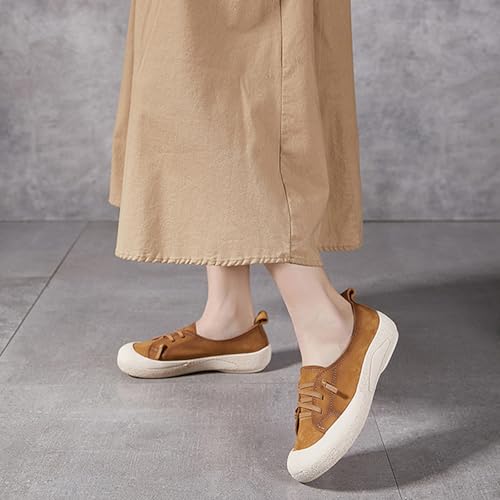 Women's Genuine Leather Elastic Laces Fashion Sneaker Retro Anti-Collision Round Toe Low Top supple Sole Walking Shoes pleasant Lightweight Casual Running Sport Shoes