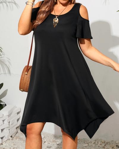 Fabric type: 95% Polyester, 5% SpandexCare instructions: Machine WashOrigin: ImportedClosure type: Pull OnPlus Size Summer Dresses: This soft and comfortable plus-size cold shoulder dress features a breathable polyester/spandex blend fabric.Flattering Casual Sundress: Enjoy a flattering scoop neckline, chic handkerchief hem, convenient side pockets, and cold shoulder short sleeves. It's a casual, flowy swing dress.Occasions for Tshirt Dress: Perfect for countless occasions - wear it daily, to the beach, to a party, for casual outings, or even to work.Sun Dresses Match: Dress it up effortlessly with jewelry and heels, or keep it casual with sandals, flip-flops, or sneakers. Add a belt and boots for a chic touch!Size Tips: Designed for a flattering silhouette. Always check our detailed Size Chart in the product description before ordering. Perfect for everyday use. first-class materials and excellent craftsmanship ensure long-lasting durability.