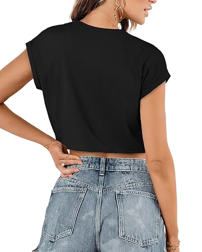 More information about Crop Tops for Women Summer Short Sleeve Loose Fit T Shirts Casual Round Neck Rolled Basic Tees