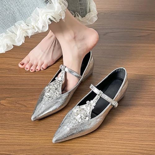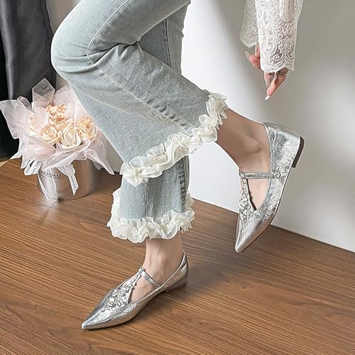 Women's Patent Leather Floral Pointed Closed Toe Internal Height Increase Mary Janes Fashion Adjustable T-Strap pleasant Flat Dress Pumps for Office Daily Dating Party
