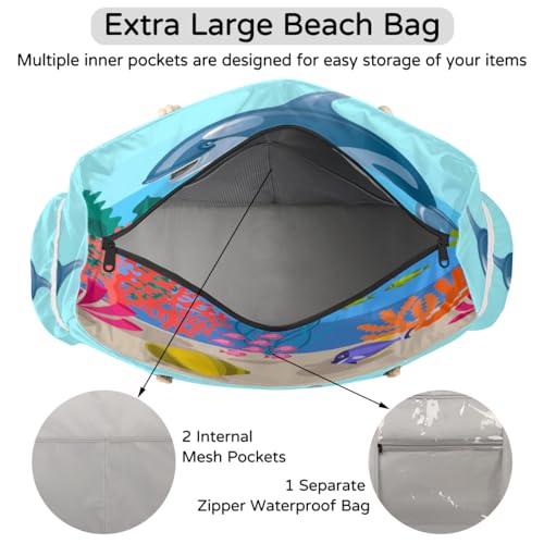 Cartoon Shark Fish Coral Beach Bag for Women Waterproof Sandproof Tote with Zipper Cotton Rope Handles for Travel Pool Gym Shopping