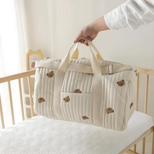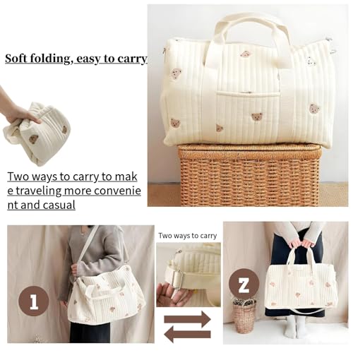SPACIOUS AND LIGHTWEIGHT: Measuring 18.90x9.45x11.02 inches, our travel bag offers plenty of capacity while remaining lightweight and easy to carry. Whether you're storing baby essentials or traveling necessities, it's the perfect travel companion.MULTIPLE CARRYING STYLES: Our mommy bag is available in both handheld and slant carry styles for your convenience. The shoulder strap is removable, allowing you to customize your carry style. In addition, the shoulder strap is designed to gently hug your shoulders, ensuring comfort even when carrying for long periods of time.MULTIFUNCTIONAL DESIGN: Our women's travel bag is extremely versatile and can be used for many purposes. It's not just for travel, it can also be used as a hospital bag, diaper bag, weekend bag, gym bag, or mommy bag, to meet a variety of needs and lifestyles.CUTE EMBROIDERY Our carry-on luggage features cute bear embroidery that adds a playful touch to your travel outfit. It's made of durable cotton fabric that's both smooth and flexible, and can be folded for storage when not in use, so it doesn't take up much space.CONVENIENT STORAGE SOLUTION: Our canvas bag for travel comes with a front pocket for easy access to your belongings and a dedicated space for items such as water bottles. The interior features separate compartments for valuables and personal items, keeping your luggage organized, efficient and practical. Perfect for everyday use. superior materials and excellent craftsmanship ensure long-lasting durability.