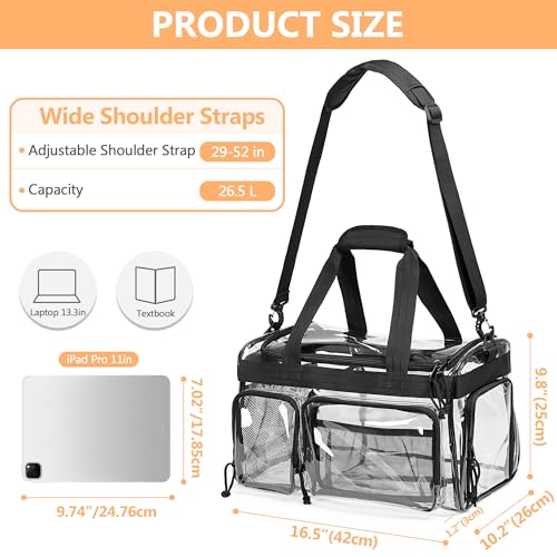 LARGE CAPACITY: Put clothes, towel and personal items in main compartment. 1 zipper pocket for phone, wallet, cards etc. 2 front pockets fit for tissues, earphone, sunglasses etc., touchscreen friendly to process message. Water bottles and umbrella can put on side mesh pocket.SHOE COMPARTMENT: 1 large zipper pocket designs specially for shoes, convenient to take shoes quickly. Also, you can separate the wet clothes or shoes from other supplies, preventing clothes or personal items getting dirty or potential odor .TRASNPARENT: Made of water-resistant PVC material, the duffle bag protects your items from water, mess and scratches. See-through surface helps you check supplies at once. Tight-stitched black webbing makes case last longer.TRAVEL FRIENDLY: Wrapped handle help you carry easily. Depending on your need, adjust and use detachable shoulder strap to free your hands. When you don’t use the travel bag, fold and put it in the luggage conveniently.WIDE USAGE: Whole bag: 16.5 x 10.2 x 9.8 inches; Shoes compartment: 11.2 x 7.2 x 7.5 inches. Meet students’ demands in school. Suitable for trip, overnight, sports activities, festivals, security checkpoints etc. Also, use for beach bag and sports bag. impeccable for everyday use. first-class materials and excellent craftsmanship ensure long-lasting durability.