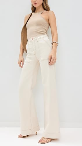 - Runs true to size, Features a high rise, a wide leg, and a puddle hem. Stretch denim has a mid-weight feel.