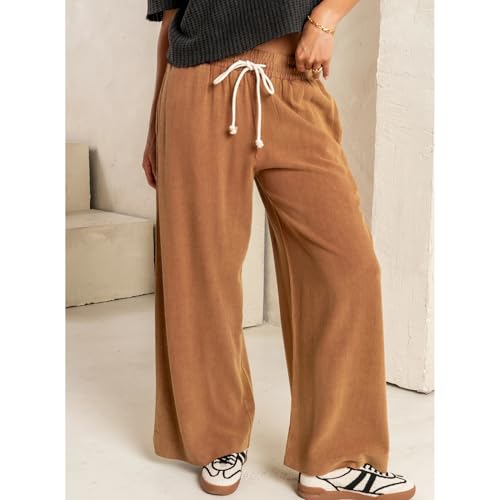 Songling Linen Pants Women Casual Palazzo Drawstring Elastic Waist Flowy Pants Wide Leg Summer Beach Trousers with Pockets