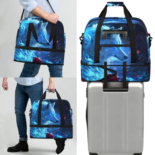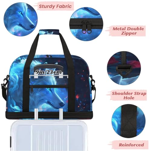 Large Weekender Overnight Bags Animal Wolf Blue Travel Duffel Bag for Women Men Gym Bag With Shoe Compartment Foldie Travel Tote Bag Carry On Personal Item Bag for Travel Gym Sports