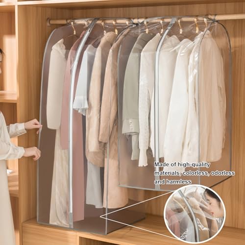 【UPGRADED SIDE ZIPPER】 Side zipper design for easy access, you don't need to take out all the clothes to get what you want. The zipper is made of first-class material, opens and closes smoothly and is durable.【SPACIOUS DESIGN】 Measures 20X8X35in and 20x20x47in 2 pack; Provides plenty of room to store up to 10 dresses, 10 sweaters or 8 heavy coats, perfect for indoor and outdoor use to keep your closet neat and organized.【DUST PROOF TOP DESIGN】The one-of-a-kind round grommets on the top of clear garment bags for hanging clothes fits most standard clothes poles, and it securely attaches to the pole with clothes on it. This unique round grommet provides better protection against dust, moisture and pet hair.【ALL CLEAR DESIGN】Clear garment bags boast a see-through design that offers visibility of stored clothes, making it easy to spot shirts, coats, sweaters, and dresses. This transparent design makes it easy to quickly identify and organize your closet, saving time and energy.【EFFICIENT HANGING】Hang your clothes easily with a plastic garment bag for hanging clothes. The hanger hook easily fits through the small hole on the top and hang in your closet. Optimize closet storage space while keeping clothes neat and easy to organize. Perfect for everyday use. High quality materials and excellent craftsmanship ensure long-lasting durability.