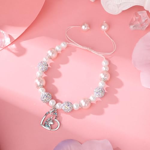 • Unicorn Magic for Dreamy Little Princesses - Ignite the imagination of your little dreamer with the Alissl Unicorn Charm Bracelet. Each pink and white pearl, strung together with care, whispers of enchanted forests and fairytales, while the unicorn charm, encased in a heart of sparkling pink and blue rhinestones, becomes her extremely own guardian of dreams.