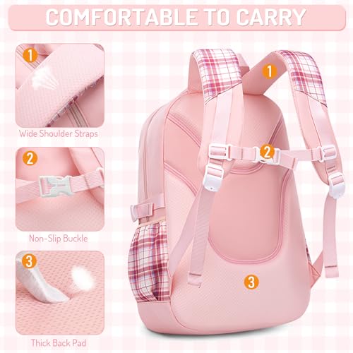 【EXQUISITE DESIGN WITH UNIQUE DETAILS】This school backpack for girls features an exquisite design with charming gingham patterns. The girls backpack with lunch box is adorned with a cute gingham bow that adds a touch of sweetness and femininity. The backpack also comes with a free white pompom, enhancing its adorable look. This cute backpack set is perfect for girls who love trendy and unique accessories, making it a standout choice for school or daily use.【SPACIOUS CAPACITY FOR ALL NEEDS】This girls backpack set with a lunch box has enough space for essentials. The 11.8x7.8x18.1 main backpack fits books and personal items. The 10.3x3.9x7.8 lunch box is great for snacks and meals, and the 8.6x2.3x4.3 pencil case keeps stationery tidy. Versatile, it's both functional and stylish for school, playdates, and daily outings.【COMFORTABLE DESIGN FOR ALL-DAY WEAR】This girls backpack with lunch box is designed with comfort in mind. It features extra-wide shoulder straps equipped with buckles to provide a secure fit, preventing the backpack from slipping off. Both the shoulder straps and the back panel are made with breathable sponge material, ensuring that the backpack remains comfortable and sweat-free even during extended use. This attention to comfort makes it an ideal choice for kids backpacks for girls.【STURDY AND RELIABLE CONSTRUCTION】This girls backpack set is designed with sturdiness in mind. Made from high-quality, wear-resistant materials, it can easily handle the demands of daily use. The smooth-gliding zippers make it easy to access all compartments, ensuring that the girls backpack with lunch box remains functional and reliable. Whether she's heading to school or on an adventure, this cute backpack set is built to last, making it a great investment for any girl.【PERFECT GIFT FOR GIRLS】This charming girls backpack with lunch box is among the most appealing kids backpacks for girls. It blends functionality and style, suitable for school and outings. The matching lunch box adds to its practicality and cuteness. Made with trendy design and high - quality materials, it's long - lasting. It makes an excellent birthday, back - to - school, or love - showing gift, sure to bring joy and become her favorite. Perfect for everyday use. excellent materials and excellent craftsmanship ensure long-lasting durability.