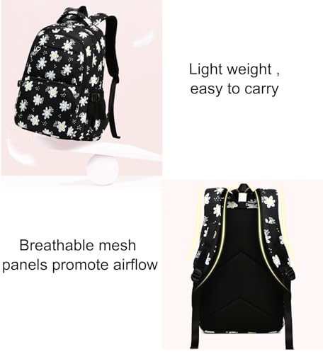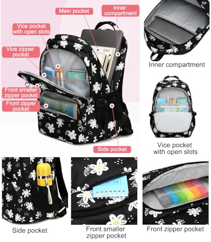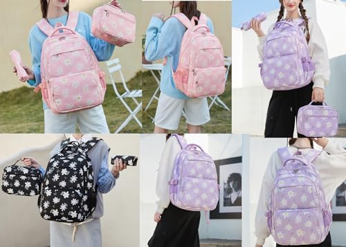 JiaYou Girls Flower Pattern Primary School Backpack Midlle School Laptop Bag 3Pcs Sets with Lunch Bag and pencil case(Pink-3Pcs,29 Liters)