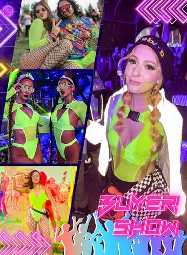 Rave Outfits for Women - EDC Festival Neon Bodysuit Concert Swimsuit Mesh Buckle Crop Top Club Party 2 Pcs Set