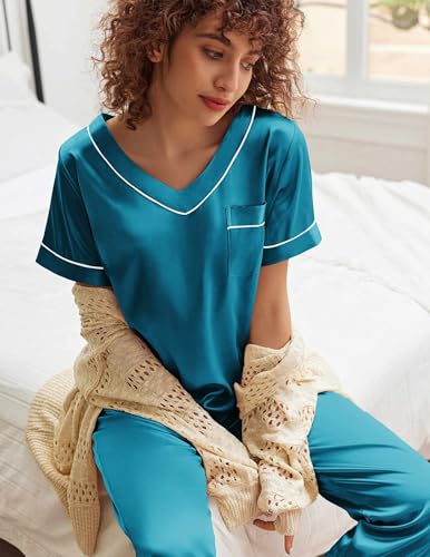 Ekouaer Satin Pajamas for Women Short Sleeve Silk Pajama Sets gentle Sleepwear Top with Causal Long Pj Pant