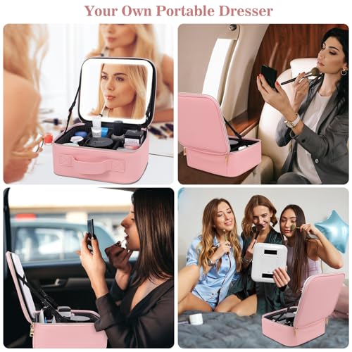 Makeup Case with LED Mirror,Makeup Organizer Bag Travel Makeup Case Large Makeup Bag With Rechargeable Mirror 3 Color Lights Detachable Mirror for Women Beauty Tools Accessories(Pink)