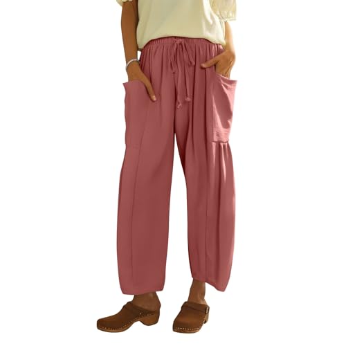 Linen Pants Women Casual Drawstring Cropped Barrel Palazzo Harem Pants with Pockets Flowy Boho Beach Lounge Pant
