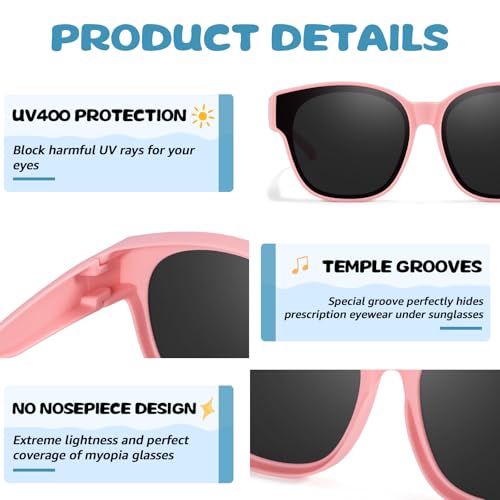 • 👓 FIT-OVER SUNGLASSES FOR KIDS: With LVIOE fit-over sunglasses, it only takes seconds to protect yourself from the sun outdoors, and just take off your sun glasses indoors. The fit over style of LVIOE sunglasses allows them to be worn over prescription glasses, making them a functional and practical choice for KIDS who need to wear glasses but still want to savor the benefits of sunglasses.