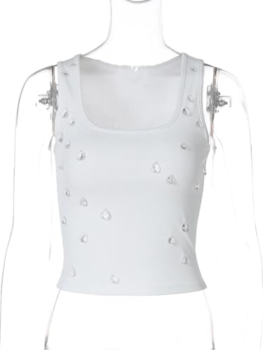 in-demand ! Women Ribbed Sleeveless Water Droplets Diamond Decorated Tank Sexy Casual Bodycon Top