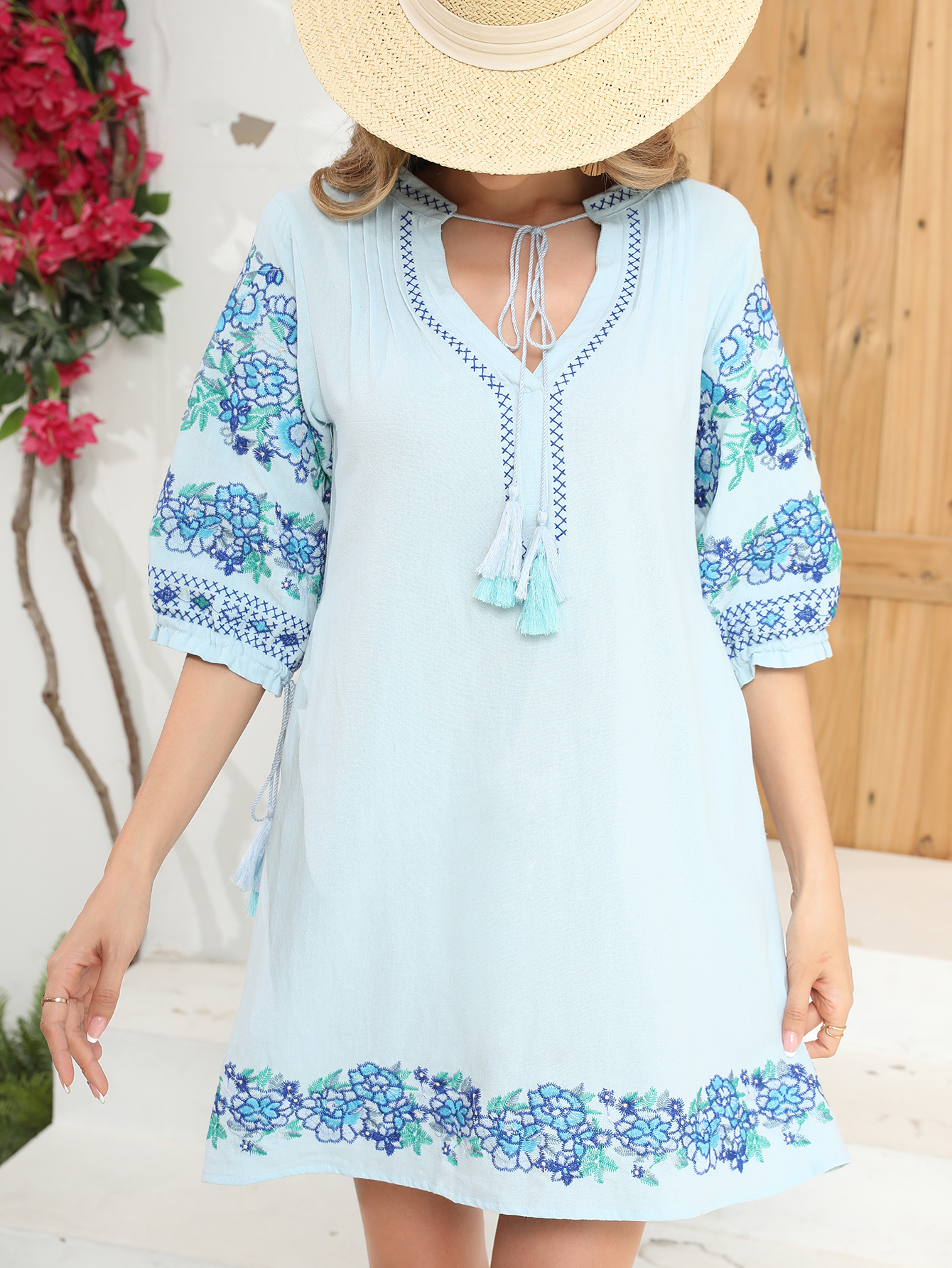 R.Vivimos Women's Tunic Dress 3/4 Sleeve Tassel Tie V Neck Casual Floral Embroidery Short Dresses