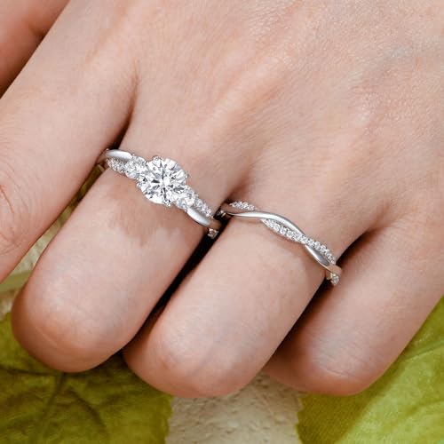 Wuziwen Three Stone Engagement Rings for Women Bridal Sets Wedding Ring for Her Eternity Band CZ 925 Sterling Silver