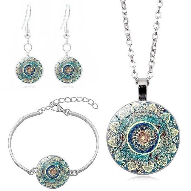 Highlights [Fabric & Material] : Crafted from high-quality alloy, this vintage jewelry set is designed to ensure durability and comfort. The intricate craftsmanship highlights the beauty of each piece, providing a luxurious feel that complements its artistic design. [Silhouette & Fit] : The necklace features a sturdy chain that provides graceful draping, with an adjustable bracelet for a perfect fit. Lightweight earrings ensure pleasant wear throughout the day, while the overall set adds a cohesive look to any ensemble. [Design Highlights] : Each piece features a stunning mandala pattern in vivid shades of blue, turquoise, and gold against a smooth, glossy finish. This design creates a charming focal point that captures attention and adds a bohemian elegance to your outfit. The delicate necklace and bracelet chains are accented by detailed circular pendants, enhancing their overall aesthetic appeal. [Occasions] : Ideal for daily wear and versatile enough for street style and holiday outings, this jewelry set seamlessly transitions from casual to chic. Whether it's a weekend getaway or a festive celebration, it adds a touch of artistic flair to any occasion. [Size Notice] : Available in one-size, this jewelry set is designed to suit a variety of wearers with its adjustable features, ensuring a comfortable and personalized fit for everyone. Perfect for everyday use. first-class materials and excellent craftsmanship ensure long-lasting durability.