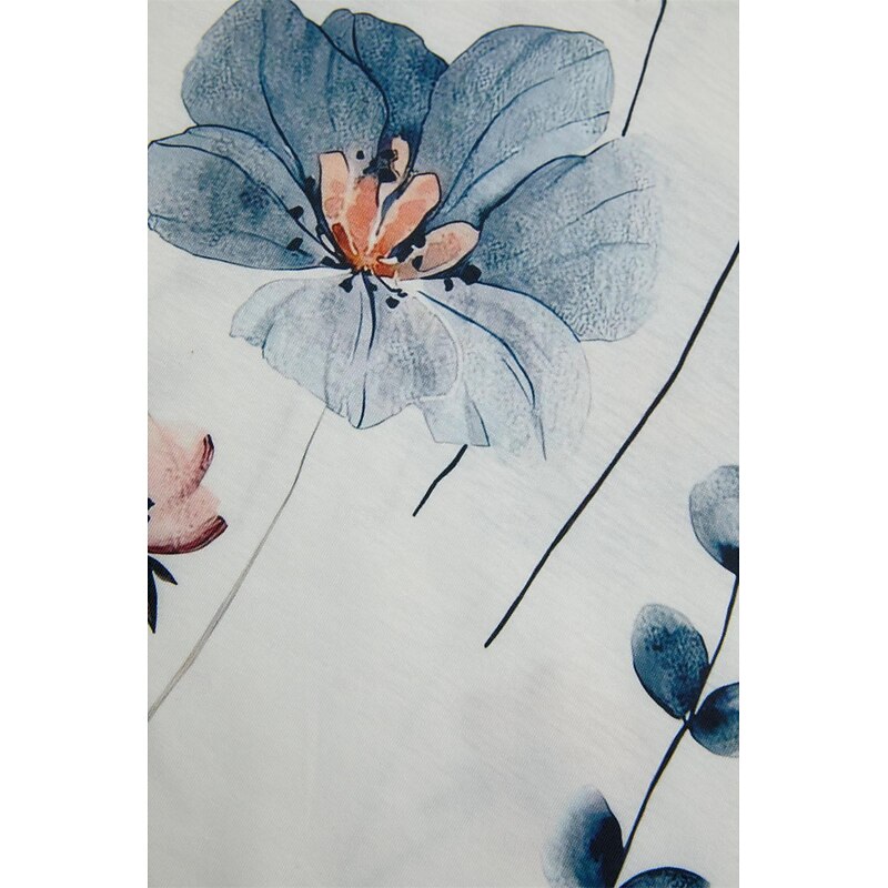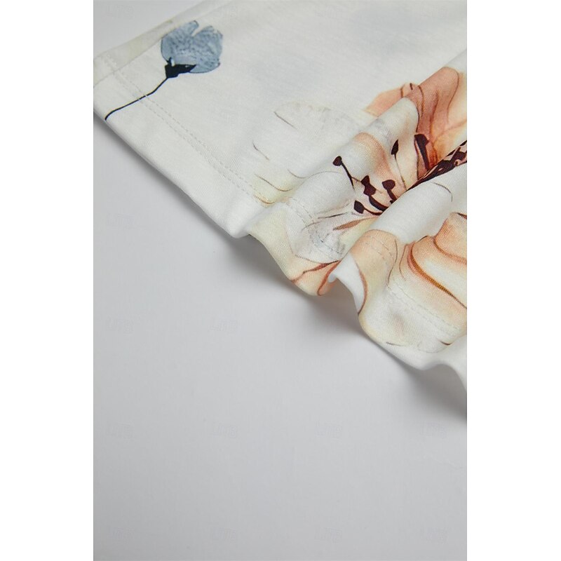 : This dress showcases a charming floral print that stands out against a crisp white background. It has a flattering V-neckline and short sleeves, offering a blend of elegance and casual style. The design is both lively and fresh, perfect for the spring and summer seasons.