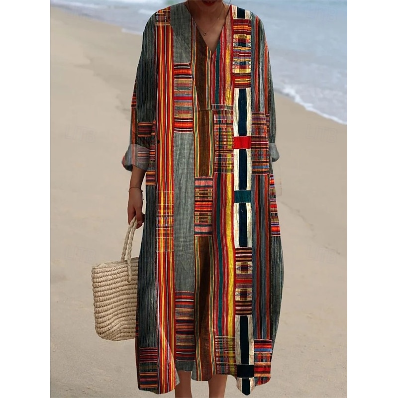 in-demand ! Women's Midi Dress V Neck Long Sleeve Kaftan Lightweight Loose Fit A Line Dress Casual Boho Going out Graphic Geometric Stripe Long Sleeve V Neck Black Yellow Pink Red Fall
