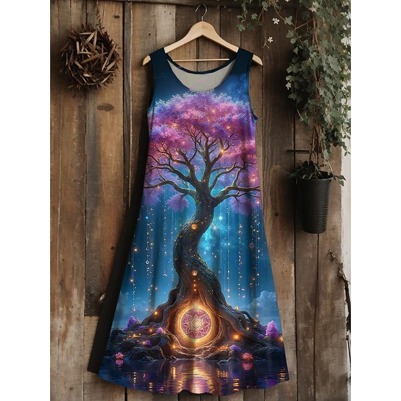 in-demand ! Women's Tree of Life Merkabah Midi Dress Sundress A Line Dress Vacation Casual Boho Wedding Party Going out Standard Fit Floral Graphic Leaf Sleeveless U Neck Blue Dark Green Purple Green Summer