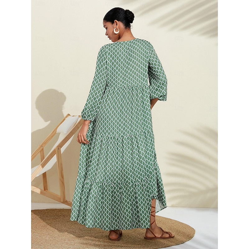 More information about Women's A Line Dress Hem Maxi Maxi Dress Green Long Sleeve Geometic Geometrical Geometrical Spring V Neck Pattern Dress uncomplicated fashion style Vacation S M L