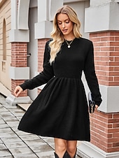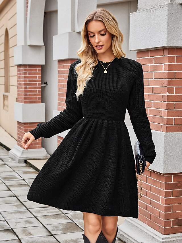 Highlights [Fabric] : Meticulously crafted from a soft and textured knit fabric, this dress offers both comfort and warmth. Its construction provides a cozy feel while ensuring durability, making it ideal for the chill of fall and winter. [Silhouette] : The dress features a fitted silhouette on the top with a flattering crew neckline, which effortlessly transitions into a flared A-line skirt. This combination creates a elegant, feminine shape that complements various body types. [Design Highlights] : This sweater dress boasts a classic crew neck and long sleeves that add an element of elegance and practicality. Its solid color design makes it a versatile piece suitable for a variety of occasions. The micro-elastic nature of the fabric allows for a perfect and comfortable fit. [Occasions] : Perfect for both casual and formal settings, this dress can be worn to parties, daily outings, or elegant evening events. Dress it up with statement jewelry and a sleek clutch for a sophisticated ensemble, or keep it simple for a chic, everyday look. [Size Range] : Available in sizes S, M, L, and XL, accommodating a range of body shapes and ensuring a comfortable and flattering fit for different wearers. Perfect for everyday use. superior materials and excellent craftsmanship ensure long-lasting durability.