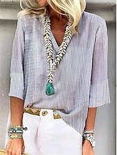 More information about Women's T Shirt Blouse Striped Casual 3/4 Length Sleeve V Neck Regular Tops Daily Print Navy Blue Gray Spring & Summer