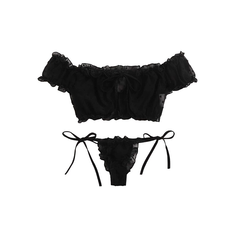 This romantic lingerie set features a seductive off-shoulder neckline with a playful dot pattern, adding a hint of allure and femininity. The outfit is designed with a drawstring closure for an adjustable fit, ensuring both style and ease of wear.