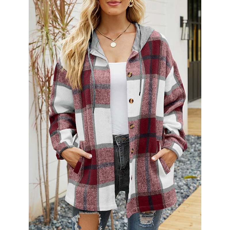 in-demand ! Women's Casual Jacket Dailywear Button Plaid Casual / Daily Vintage Loose Fit Outerwear Long Sleeve Summer Wine Red S