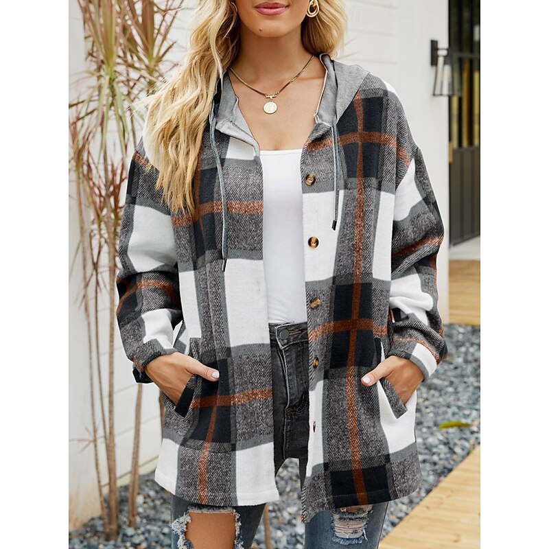 Highlights [Fabric] Crafted from a comfortable and soft fabric blend, this casual jacket provides warmth and coziness throughout all seasons, thanks to its micro-elastic properties. [Fit] This outerwear features a loose fit that ensures comfort and ease of movement. With its regular outerwear length, it is perfect for layering over your favorite outfits. [Design Highlights] The jacket showcases a chic plaid pattern in shades of green and white, paired with a iconic crewneck. Its button-up front allows for versatile styling, while the adjustable drawstring hood adds additional warmth. Two practical pockets enhance its functionality, making it ideal for everyday wear. [Occasions] Perfect for daily wear, going out, and casual gatherings, this jacket effortlessly complements your wardrobe. It is a versatile choice for various outings, ensuring style and comfort while pairing seamlessly with jeans or leggings. [Size Range] Available in a range of sizes including S, M, L, XL, and XXL, this jacket can accommodate different body types, providing a comfortable and chic fit for everyone.