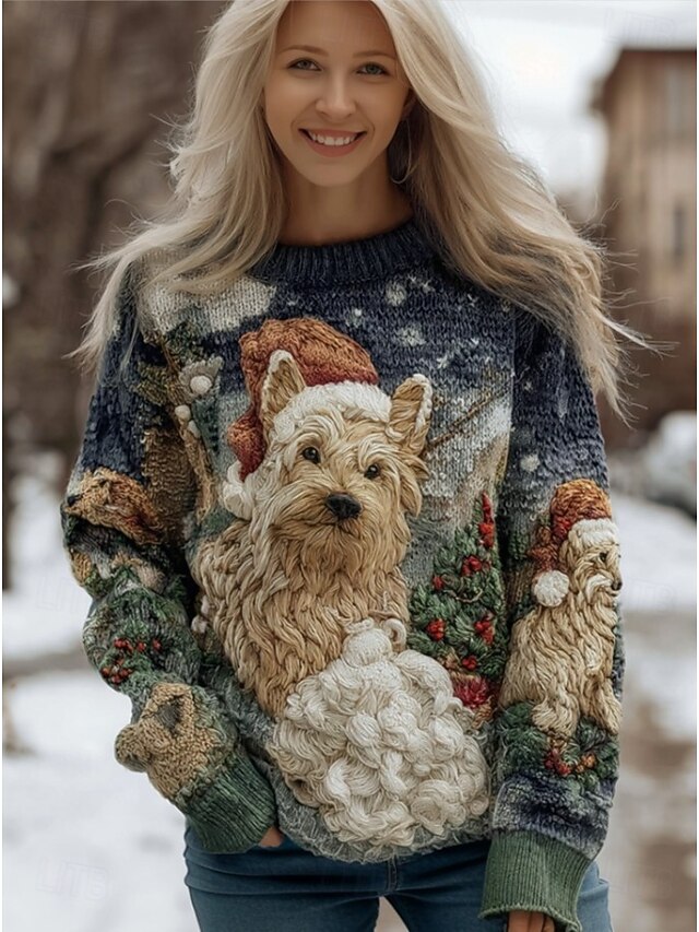 More information about Women's Sweater Fashion Casual Graphic Animal Crew Neck Knitted Long Sleeve Regular Tops Knit Work Daily White Blue Fall Winter