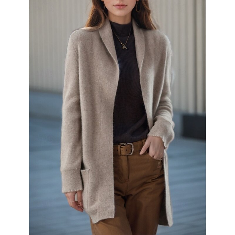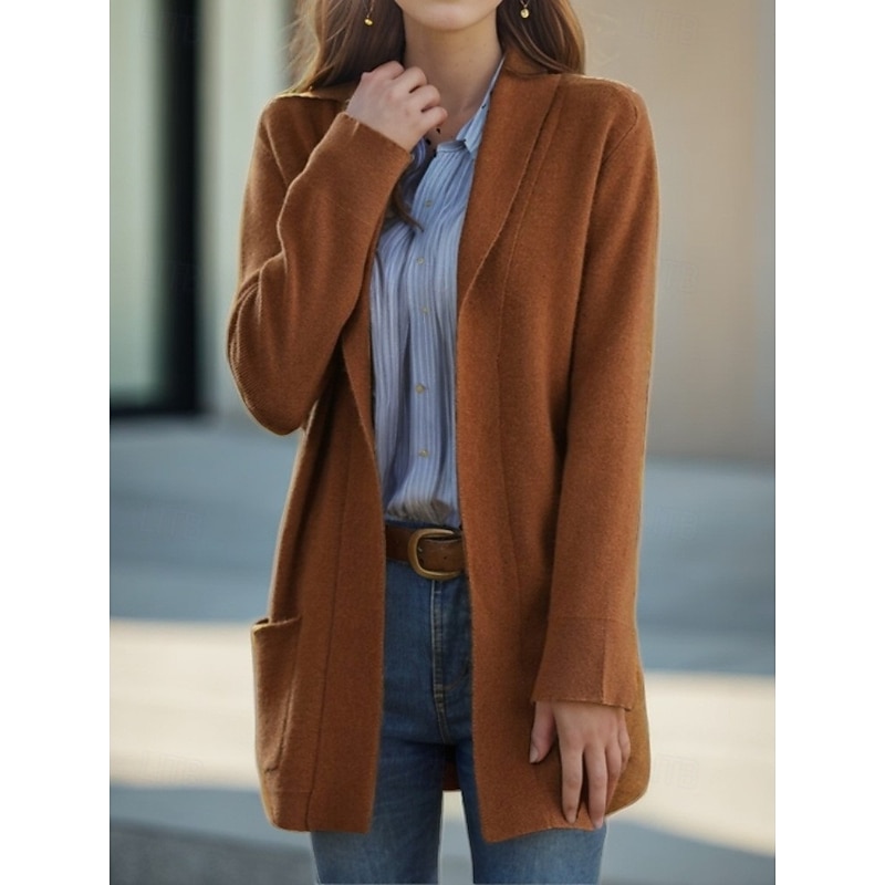 Highlights [Fabric] : Expertly crafted from a high-quality polyester knit, this women's cardigan offers a soft, comfortable feel with great elasticity, ensuring a versatile fit for various body shapes. The durable fabric makes it ideal for regular wear, while maintaining its chic appearance. [Fit] : Designed with a regular fit, this cardigan features long sleeves and a mid-thigh length, making it a perfect layering piece for both transitional and cooler weather. It's tailored to offer a balance between comfort and style, providing warmth without sacrificing a present-day look. [Design Highlights] : The cardigan showcases a sophisticated shirt collar and a practical open-front design, allowing for effortless styling with other tops. It comes equipped with functional front pockets, adding a touch of convenience and style. Available in classic colors like black, camel, and brown, it seamlessly integrates into any wardrobe. [Occasions] : This versatile cardigan is ideal for daily wear, whether at home, weekends, or casual outings. Its timeless design makes it suitable for both relaxed and slightly more polished settings, effortlessly elevating any casual ensemble. [Size Suggestion] : Available in sizes S, M, L, and XL, this cardigan offers a standard fit. It's recommended to select your usual size for the best fit. Perfect for everyday use. superior materials and excellent craftsmanship ensure long-lasting durability.