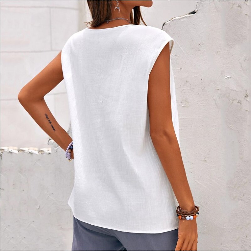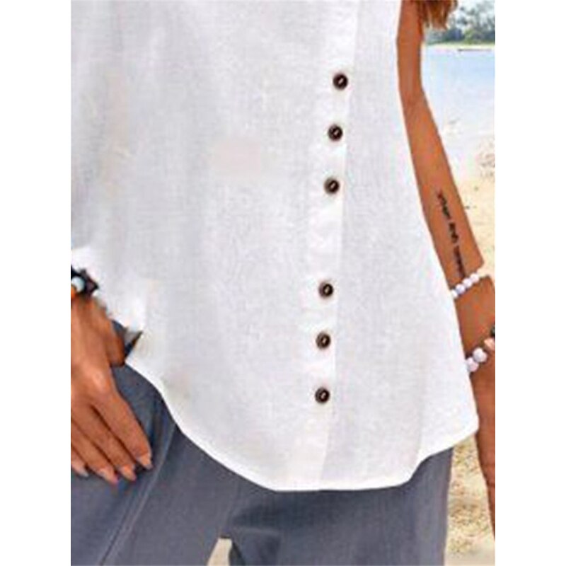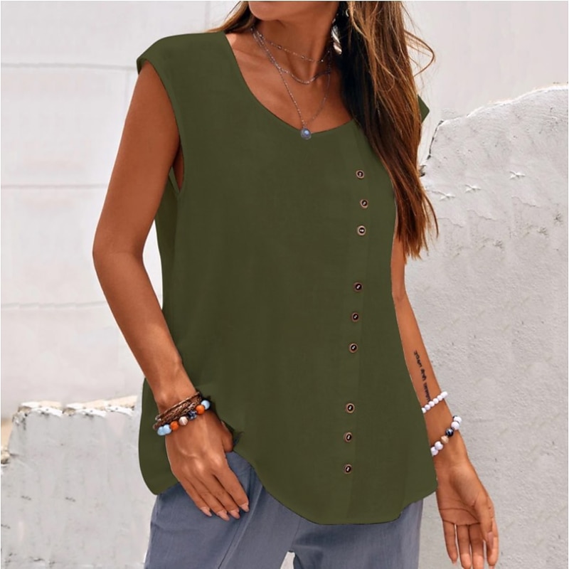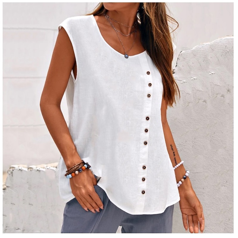 Highlights [Fabric] : Crafted from premium linen, this women's tank top offers breathability and comfort, making it ideal for warm weather and laid-back days. The linen fabric ensures a lightweight feel and coolness, perfect for those sunny beach outings. [Fit] : The top features a regular fit with a sleeveless, airy design, providing ease of movement and a casual vibe. Its relaxed fit and round neckline contribute to a chic and effortless look. [Design Highlights] : This tank top comes with a series of decorative buttons on one side, adding a sophisticated and chic touch. The simple yet elegant design makes it versatile enough to pair with various bottoms. [Occasions] : Perfect for casual weekends, beach outings, and everyday wear. This versatile top is a great addition to your summer wardrobe, effortlessly blending into any laid-back or tropical setting. [Size Range] : Available in a range of sizes including S, M, L, XL, 2XL, and 3XL, ensuring a suitable fit for various body types and preferences. Perfect for everyday use. first-class materials and excellent craftsmanship ensure long-lasting durability.