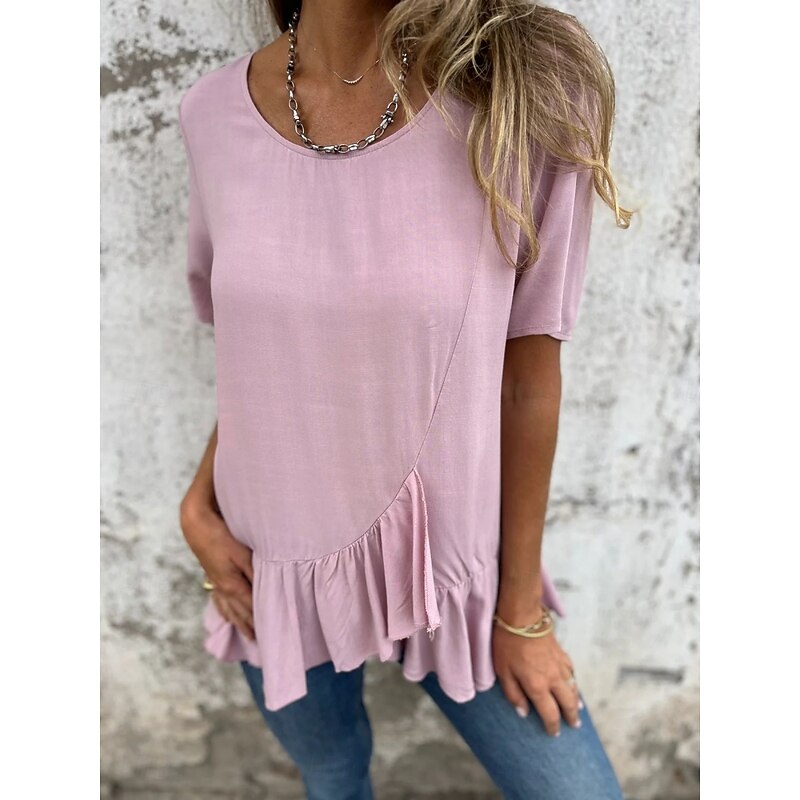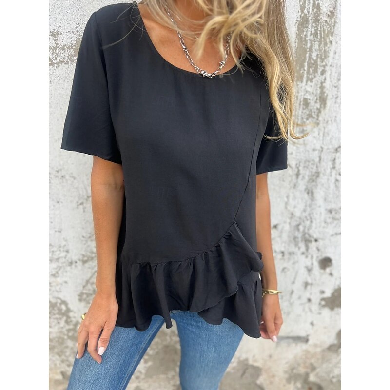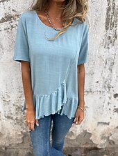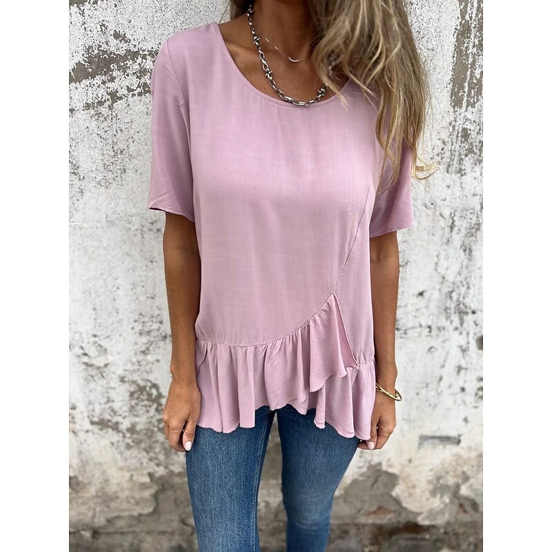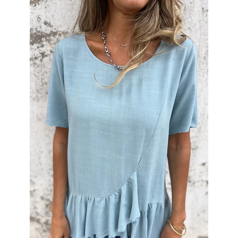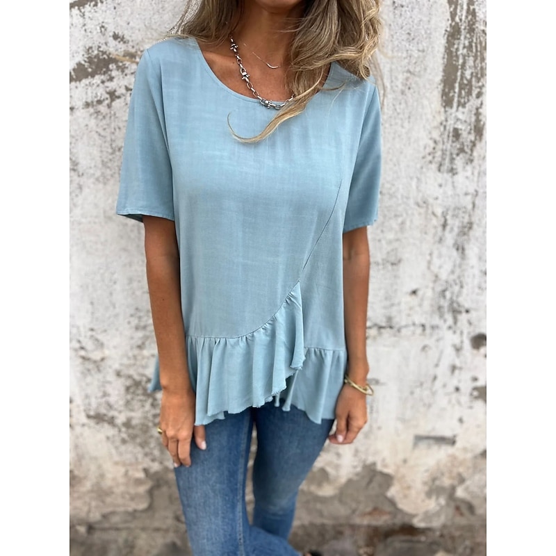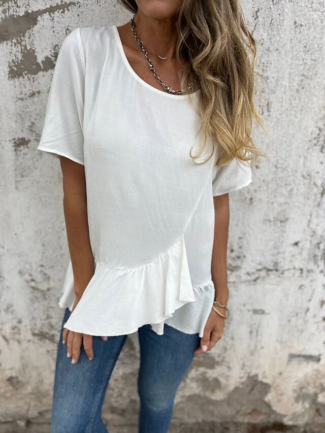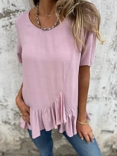 More information about Women's Cotton Linen Shirts Solid Color Daily up-to-date Short Sleeve Crew Neck Regular Tops Daily Holiday Ruffle Black White Pink Blue Summer