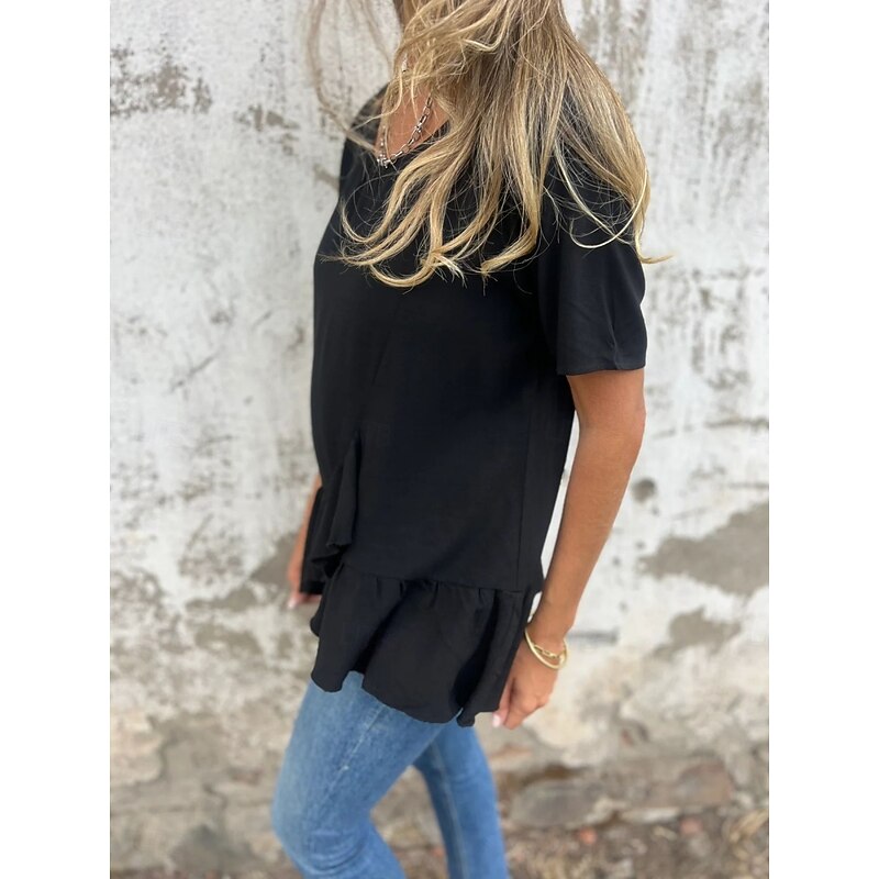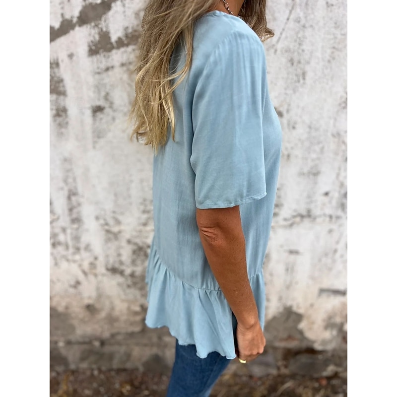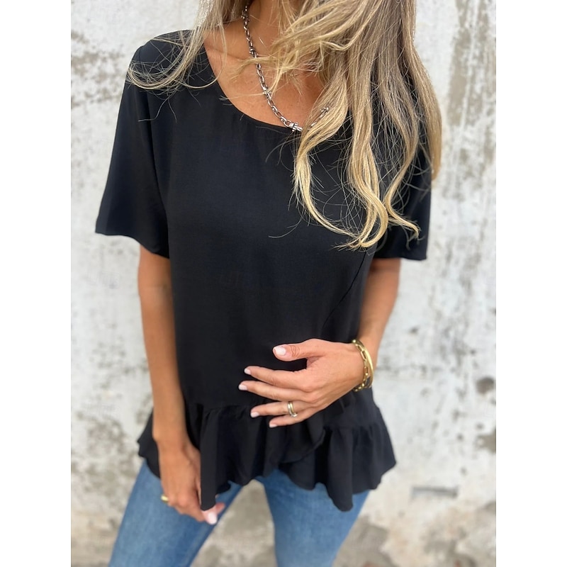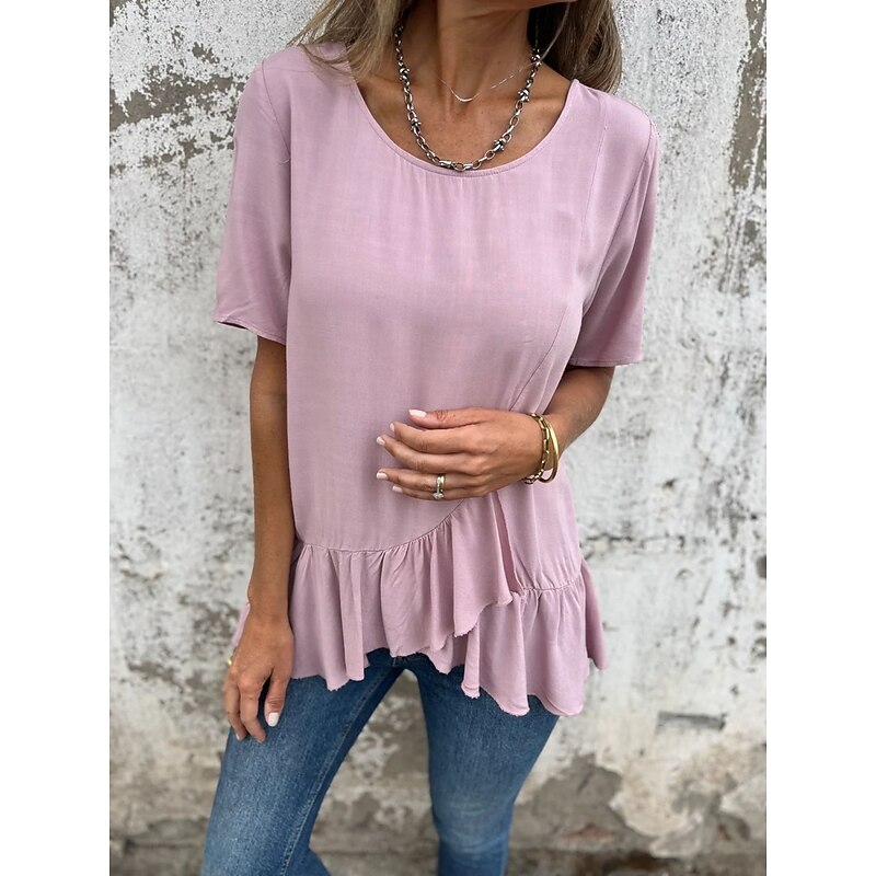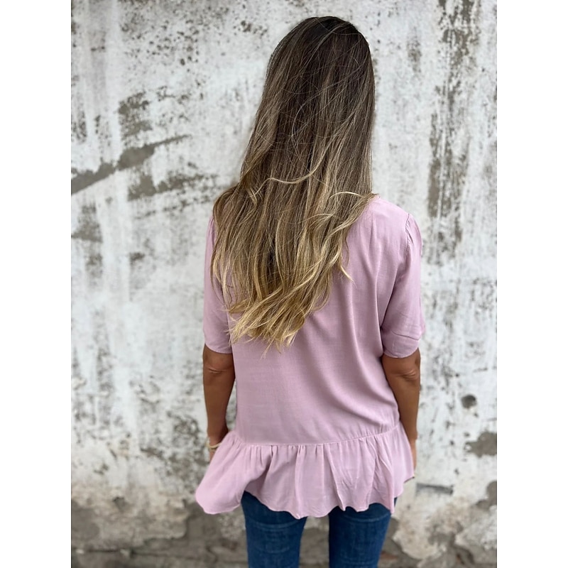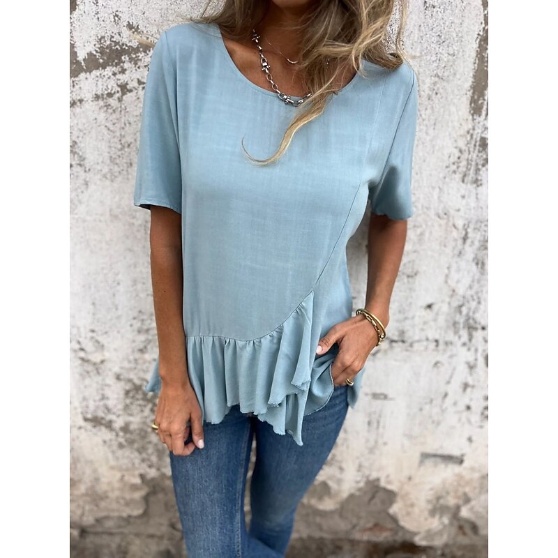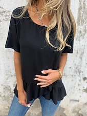 More information about Women's Cotton Linen Shirts Solid Color Daily up-to-date Short Sleeve Crew Neck Regular Tops Daily Holiday Ruffle Black White Pink Blue Summer