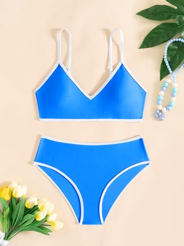 - Features: Plain solid color, contrast binding, v neck, 2 piece swimwear for teen girls