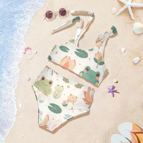 Cute Cartoon Frog Animal Sitting Flower Leaf Girl 2 Piece Kids Bikini Set Beach Bathing Suit Swimming Suits Adjustable