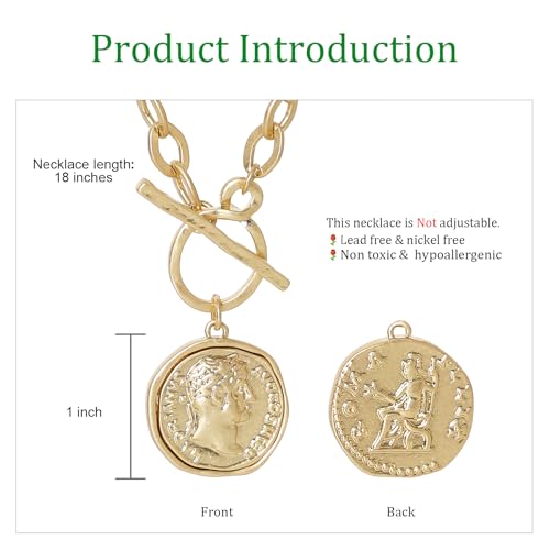 Material: Alloy SteelMetal type: ZincClasp type: ToggleGem type: No Gemstone【DESIGN】:This necklace is composed of an Antique toggle chain and a double-sided one-of-a-kind retro patterned coin pendant. The necklace is non adjustable and the pendant is non removable. There are two colors to choose from.【MATERIAL】:This necklace is made using eco-friendly alloy and 18K gold-tone plating.The necklace is lead free, nickel free, non toxic, hypoallergenic, comfortable to wear and won't fade easily,safe and enduring.【SIZE】: The necklace length is 18 inches.Non adjustable.【OCCASION】:This necklace make perfect gifts, are prefect for women. An ideal gift for Christmas, Valentine's Day, Mother's Day, birthdays, or a wedding celebration. Even better when purchased for yourself, you deserve it.【CUSTOMER SERVICE】:365 day quality assurance.We are committed to providing better service to our customers, if you have any questions, contact our representatives, we will help to solve the problem within 12 hours. Perfect for everyday use. first-class materials and excellent craftsmanship ensure long-lasting durability.